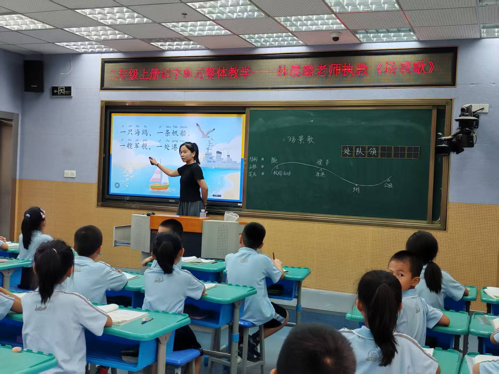 金秋九月,桂香氤氲。9月18日星期四下午,力行楼6楼录播室里,一场以“识字单元整体教学”为主题的语文校本教研活动有序开展。活动由陈立珊老师主持,黄蕴华、林晨璐两位教师先后执教二年级上册《场景歌》第一、二课时,为在场教师呈现了两节聚焦识字目标、贯穿单元理念的精彩示范课。 黄蕴华老师执教的《场景歌》第一课时以“基础启蒙”为核心,紧扣单元整体理念开篇。教学聚焦第一、四小节,通过结合插图、辨析用法等方式,引导学生实现识字与理解、文本与生活的深度联结。课末还围绕“处、队、领”三字开展细致写字指导,落实“提笔即练字”要求,为单元识字筑牢基础。 林晨璐老师的第二课时以“跟随‘红领巾’继续探秘”的复习导入,无缝衔接上节课内容,延续“场景旅行”主线。课堂聚焦第二、三小节的乡村、公园场景,以“同桌互读、圈画景物、图文对照”的自主任务将识字主动权交予学生,通过形声字规律、图片联想等方法引导学生学习生字,同步拓展量词用法。课末布置“制作量词画报”作业,呼应单元整体任务,完美构建“识字—理解—运用—迁移”的教学闭环。 课后,陈立珊老师主持研讨环节,全体语文教师围绕活动主题展开热烈交流。老师们特别肯定了“情境贯穿”“图文结合”“生活联结”的教学策略——从“大自然字典”的单元情境到“红领巾郊游”的课文情境,从插图辅助理解到生活实例拓展,让识字不再是孤立的符号记忆,而是与语境、生活、表达紧密结合的综合学习。潘副校长进一步提出,识字单元整体教学需明确单元核心目标与课时目标的关联性,确保同一课前后课时目标具体化且逻辑衔接;同时强调识字教学要兼顾方法传授与生活拓展,引导学生在生活中识字,还指出低年级课堂需遵循动静结合原则,包含朗读、识字、写字等环节。最后,陈立珊老师梳理核心观点并总结,强调语文学科核心素养目标撰写需避免空泛,要体现学科特性并明确达成与评估方式,且当前课堂需优化气氛、补充合作学习环节,通过提供真实场景与时间激发兴趣、培养规则,保障教学目标落地。大家纷纷表示,这为低年级识字单元教学提供了可借鉴的实践范式,为落实“在语境中识字、在运用中巩固”的课标要求开拓了思路。 此次《场景歌》校本教研活动,以两课时连贯教学为载体,深度拆解“识字单元整体教学”的实施路径。不仅展现了我校语文教师深耕课堂的专业素养,更为全体语文教师搭建了交流学习的平台,为后续低年级识字教学提质增效注入了新的动力。(文字:林捷红 图片:林捷红、李颖 审核:教研室)